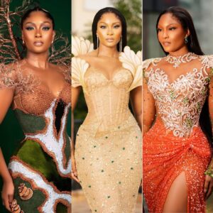 A collage of three iconic fashion looks worn by Osas Ighodaro designed by Veekee James, featuring the Mother Earth, 30th Birthday, and 3 Cold Dishes premiere outfits. If you aren’t obsessed with the Osas Ighodaro and Veekee James duo, are you even looking at your feed? Osas has been a
