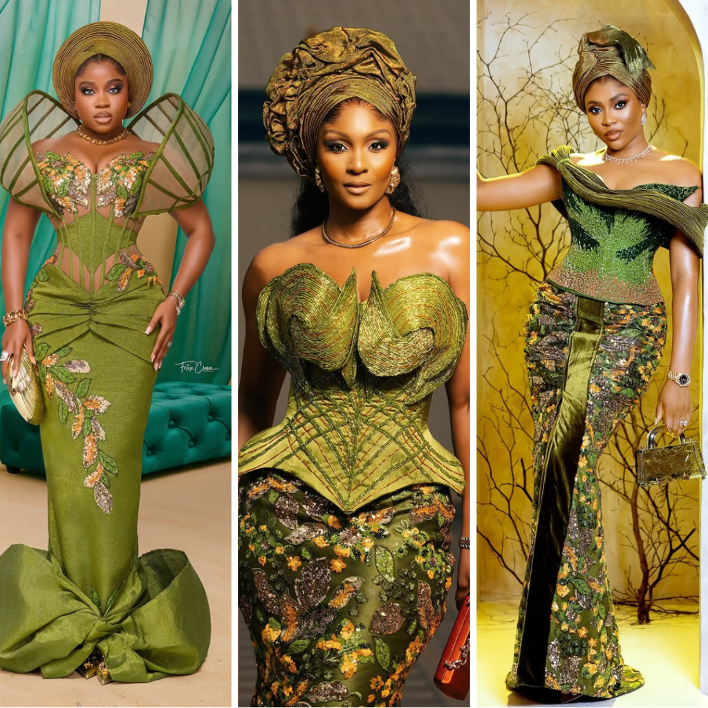At Priscilla Ojo and Juma Jux’s traditional wedding, it wasn’t just the bride and groom who brought the glamour. The ladies in green aso ebi delivered unforgettable style moments with corset bodices, soft drapes, and bold accessorising.