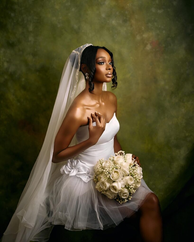 To get your merry day going, Idowu designed this elegant strapless mini dress with a structured bodice that beautifully highlights the silhouette. The standout feature is the fancy tulle skirt adorned with delicate flowers at the waist, adding a romantic touch to this ethereal look. WA Tife Hairs styled the hair in a lovely updo with soft curls framing her face, while The Makeup Faculty enhanced the full ensemble with soft, glowy makeup. Nothing basic here — just pure sophistication, fun, and fab energy for the bride who’s ready to celebrate in style! Let us know, would you rock this for your bridal shower?