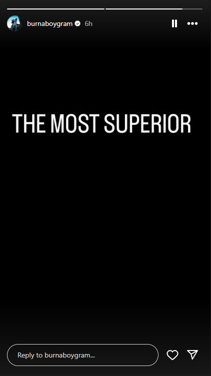 Grammy award-winning singer Burna Boy has ignited a firestorm of debate with a bold and cryptic declaration on his Instagram story. The Nigerian music sensation simply stated, “THE MOST SUPERIOR,” leaving fans and critics to speculate about the context and meaning behind his words. Although Burna Boy did not provide further clarification, many have inferred
