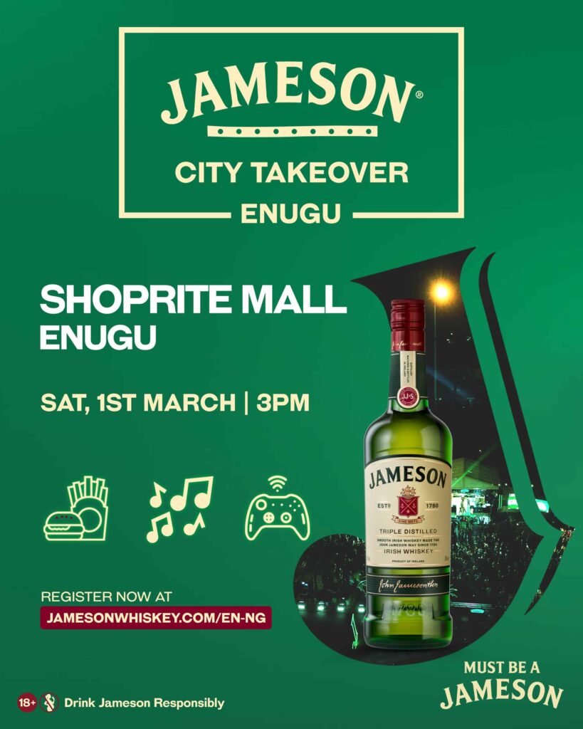 On March 1, 2025, Jameson Irish Whiskey will bring its distinctive City Takeover experience to Enugu at Shoprite Polo Park Mall. This evening will blend Enugu’s warm heritage with its signature vibrant energy. Designed to foster connection, creativity, and fun, this event invites residents and visitors to come together for an unforgettable evening.