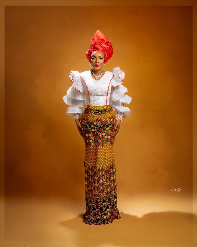 But let’s talk about that Gele—towering, bold, and flawlessly tied, it ties the whole look together while nodding to the vibrant accents in her outfit. Can we take a moment to appreciate this look?