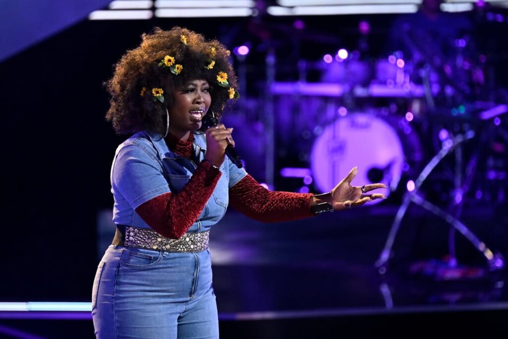 Alexia Jayy performing on The Voice stage in a denim jumpsuit and red textured sleeves with sunflowers in her hair. Photo Credit: Alexia Jayy/Instagram
