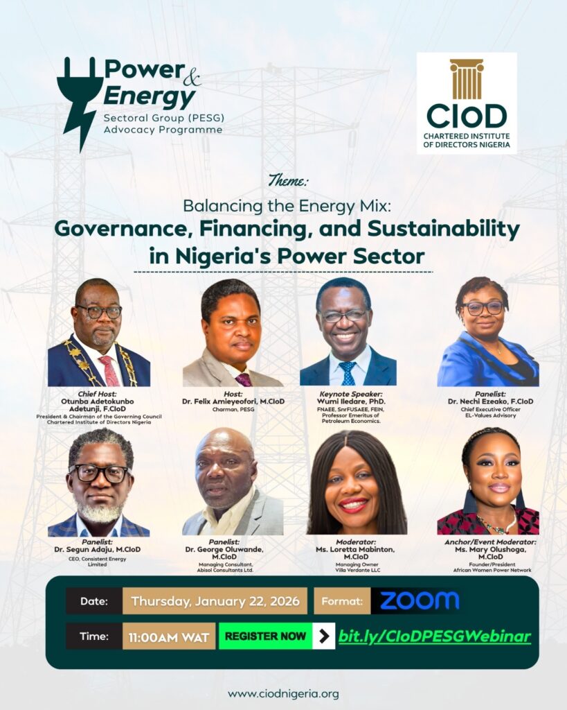 The upcoming Chartered Institute of Directors (CIOD) Nigeria Event titled, “Balancing the Energy Mix: Governance, Financing, and Sustainability in Nigeria’s Power Sector,” is scheduled to take place on Thursday, January 22, 2026 at 11AM (West African Time).
