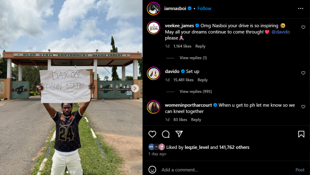 To kick off his campaign, Nasboi shared a photo of himself kneeling with a placard at the Osun State Government Secretariat, marking Day 001. On Thursday, May 29, he proceeded to Kano State, continuing his mission with the same placard appealing for Davido’s attention.