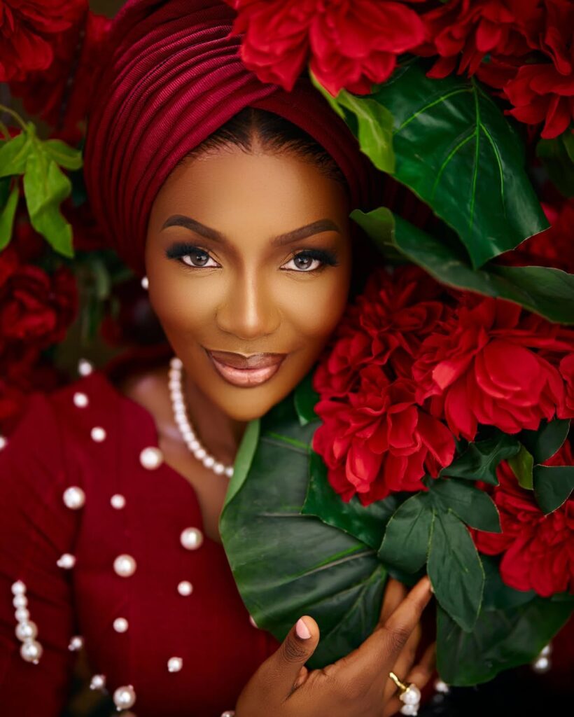 She dropped a series of looks, and each one deserves its own spotlight. First up, a deep red asooke dress with sculpted sleeves and pearl embellishments that ran across the fabric like carefully placed jewels. She paired it with a matching gele and white pearls that brought the whole look together in the most regal way.