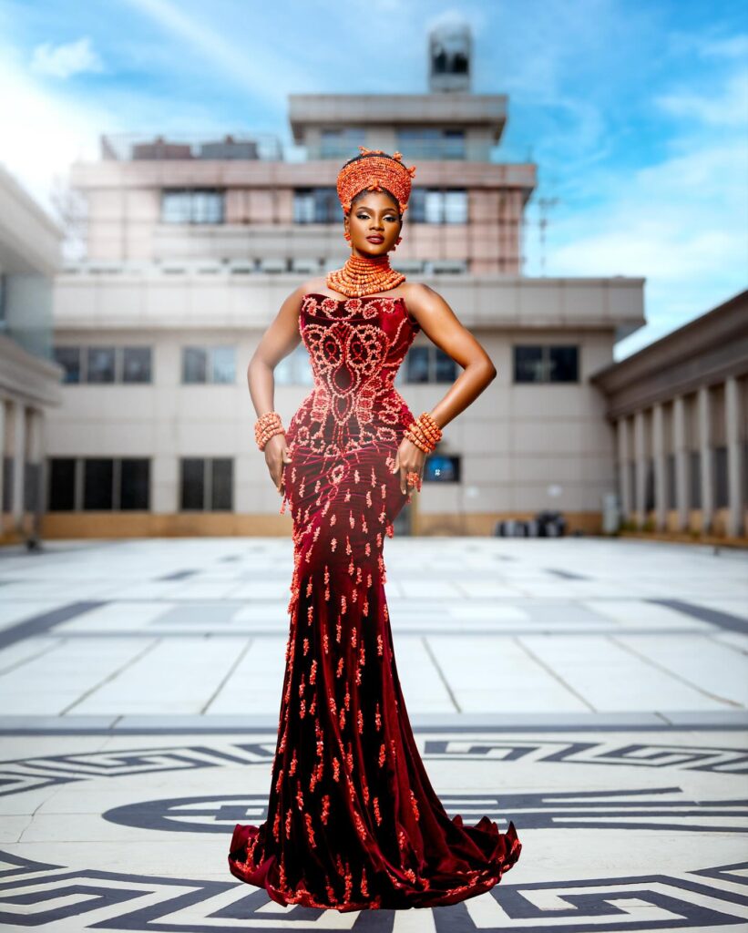 Trish O. Couture designed this lovely dress that does justice to this vision. The Edo traditional-inspired look features a luxurious burgundy velvet dress with dramatic detachable off-shoulder sleeves and a bodice adorned with intricate coral beadwork that is absolutely stunning. True to recognising heritage, Okuku by Fola crafted the elaborate Okuku headpiece, layered coral necklaces, and matching accessories, giving the ensemble a regal finish. To ensure the hair stayed perfectly upright and gorgeous, Brown Shuugaa Extravaganza styled it in the traditional Edo bridal updo that adds even more radiance to the final appearance. It’s a bold, stunning look for the bride who desires luxury in its finest form. Yet to decide on a look for your Edo trad? This might just be the right choice.
