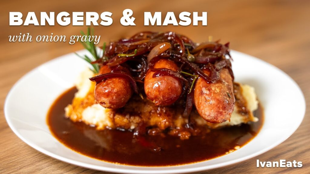 Ivan Eats brings his twist to this classic with a hearty onion gravy that really brings the dish to life. The onions give the gravy body and richness, making it the ideal topping for the sausages and mashed potatoes.
